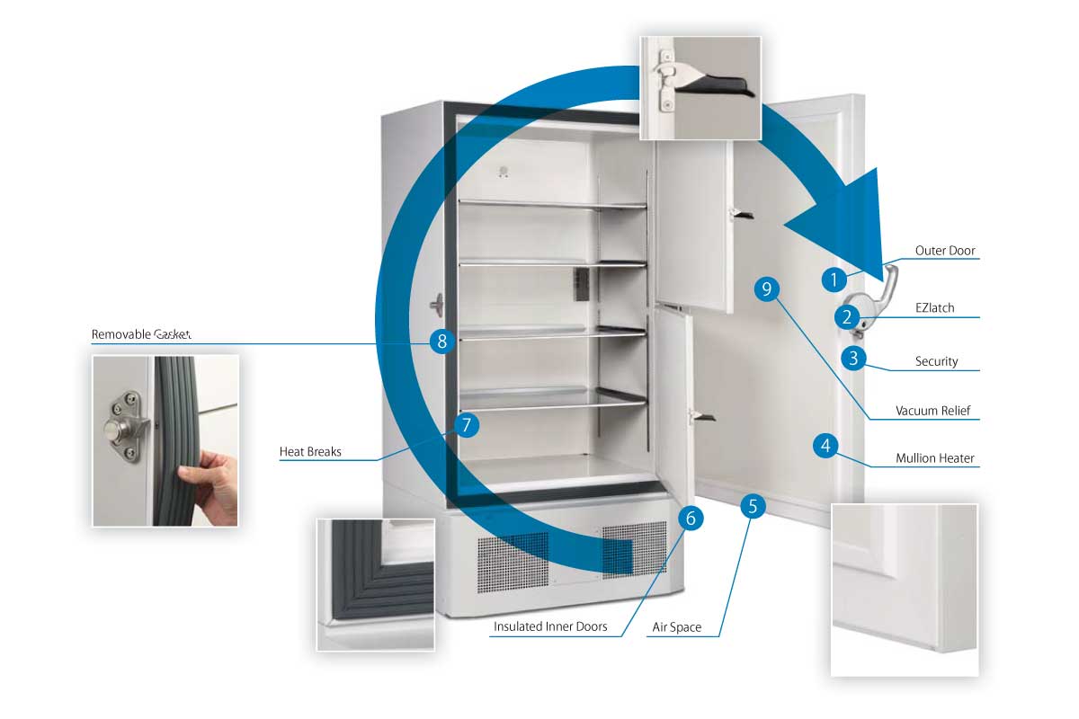 ⑧ Gaskets Multi-point door gaskets create micro air breaks around the face of the cabinet, restricting moisture migration into the cabinet and minimizing frost. Gasket composition withstands extreme rela-tive temperature differentials while remaining flex-ible, ensuring a full peripheral door seal. The outer door gasket can be easily removed and replaced with-out tools while the freezer can remain in operation with no downtime.