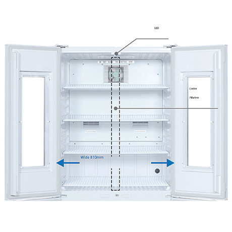Wide 810mm refrigerator doors without center obstruction allow even large containers to be easily stored and removed. Interior visibility is excellent with LED lighting.