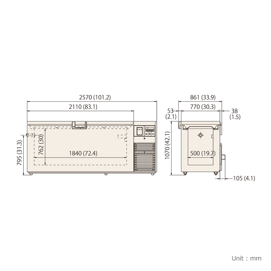 In case of power failure or an irregular rise in temperature, a rechargeable battery-operated indicator lamp and alarm will be activated. A compact recording unit which automatically records the inside temperature, and a backup system with liquefied CO2 or N2 which is selfactivated when a power outage occurs are also available separately. This equipment helps insure that the contents will be protected in the event of any power failure or mechanical trouble.*