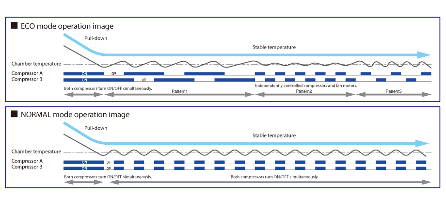 “ECO mode” is an industry first feature. The two compressors, A and B, are independently controlled to optimise operation efficiently to minimise energy consumption by monitoring freezer load status.