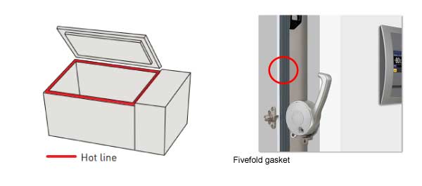 series): PHCbi developed the new gasket structure by the repeated testing comparing to the other ULT freezers available from market. Firm gasket structure with "Fivefold" air space increases insulation performance and prevents foreign material (ex. frost building up) comes in. It contributes to reduce the frequency of manual defrosting around the gasket for more conformable use.