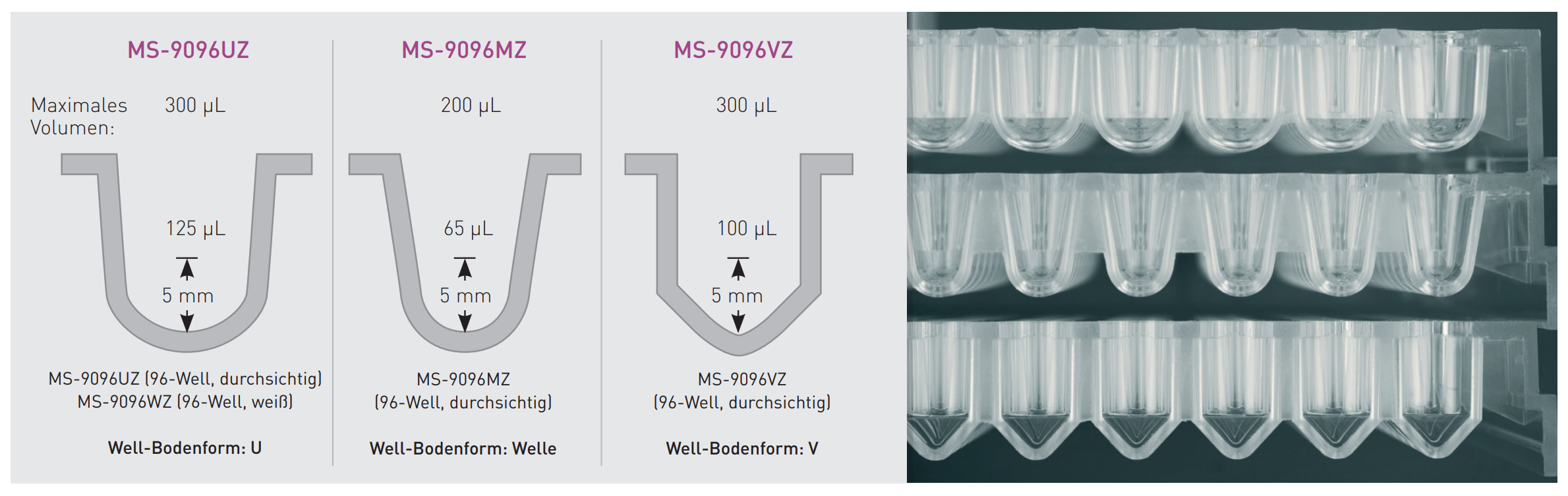 • Verschiedene Bodenformen der Wells verfügbar: U-Form, Wellenform und V-Form im 96-Well-Format