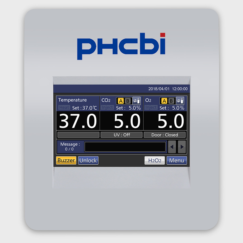 - PHCbi proprietary single-beam, dual detector infrared (IR2) CO2 sensor