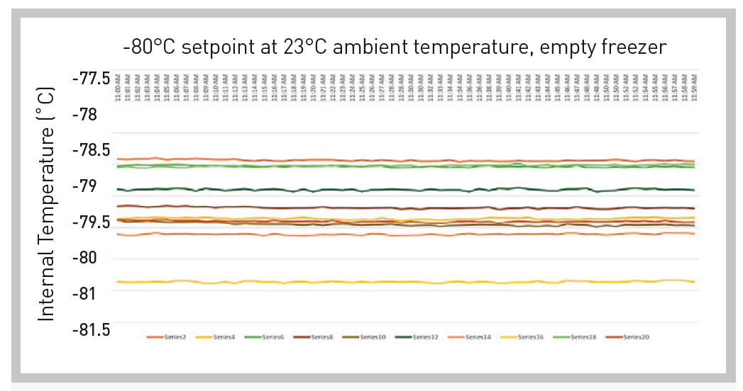 Inverter driven compressors with SMART control allow for superior uniformity by running compressors at slower speeds under steady state conditions. Proprietary algorithms give the control that allows extremely tight temperature uniformity.