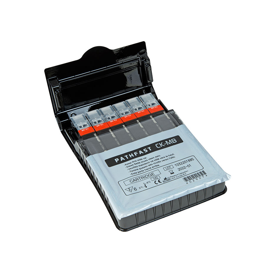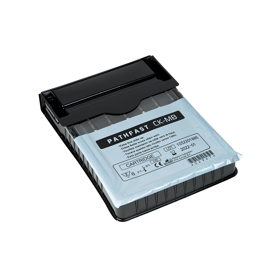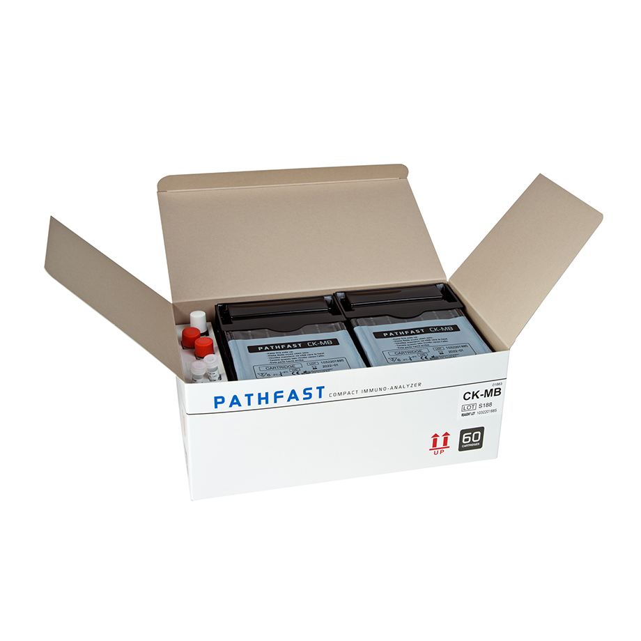 PATHFAST™ CK-MB is a product for in vitro diagnostic use with the in vitro diagnostic system PATHFAST™ for the quantitative measurement of CK-MB in heparinized whole blood and plasma. The result obtained with the assay is used to assist in the diagnosis of acute myocardial infarction. Creatine kinase (CK) is a key enzyme of energy metabolism in muscle that catalyzes the reversible phosphorylation of creatine. This dimeric enzyme has two subunits, M and B, which associate to form three isoenzymes, CK-MM, CK-MB and CK-BB. CK-MM and CK-BB are distributed primarily in the skeletal muscle and in the brain, respectively. CK-MB is found predominantly in cardiac muscle accounting for approximately 10 – 40% of myocardial CK. Damage to the myocardium results in a transient and progressive release of CK-MB into the circulation. The CK-MB concentration increases at 2.5- 5 hours after onset of chest pain reaching a peak at 12 to 24 hours and then returning to normal levels within 48 to 72 hours. This characteristic temporal pattern is diagnostic for AMI. The low concentration of CK-MB in serum of healthy subjects and non-cardiac tissues contributes to its widely accepted use as an aid for diagnosing and monitoring of myocardial injury.