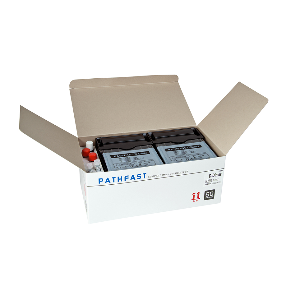 PATHFAST™ D-Dimer is a chemiluminescent enzyme immunoassay for the quantitative measurement of D-Dimer concentration in whole blood or plasma. PATHFAST™ D-Dimer is used an aid in the diagnosis of activation processes of the coagulation system including deep vein thrombosis (DVT) and pulmonary embolism (PE). Plasmin-induced lysis of crosslinked fibrin results in the formation of D-dimer containing fibrin degradation fragments (XDP). D-dimer is a specific marker of the degradation of factor XIIIa- crosslinked fibrin and an indirect early marker of activation of coagulation and clot formation. The plasma concentration of D-dimer is elevated in clinical conditions associated with activation processes of the coagulation system including DVT, PE, and DIC. The exclusion of DVT or PE in patients suspicious for venous thromboembolism is possible if the D-dimer concentration is below the cut off value established by numerous clinical studies. D-dimer measurement is also usable as an aid in diagnosis and monitoring of DIC