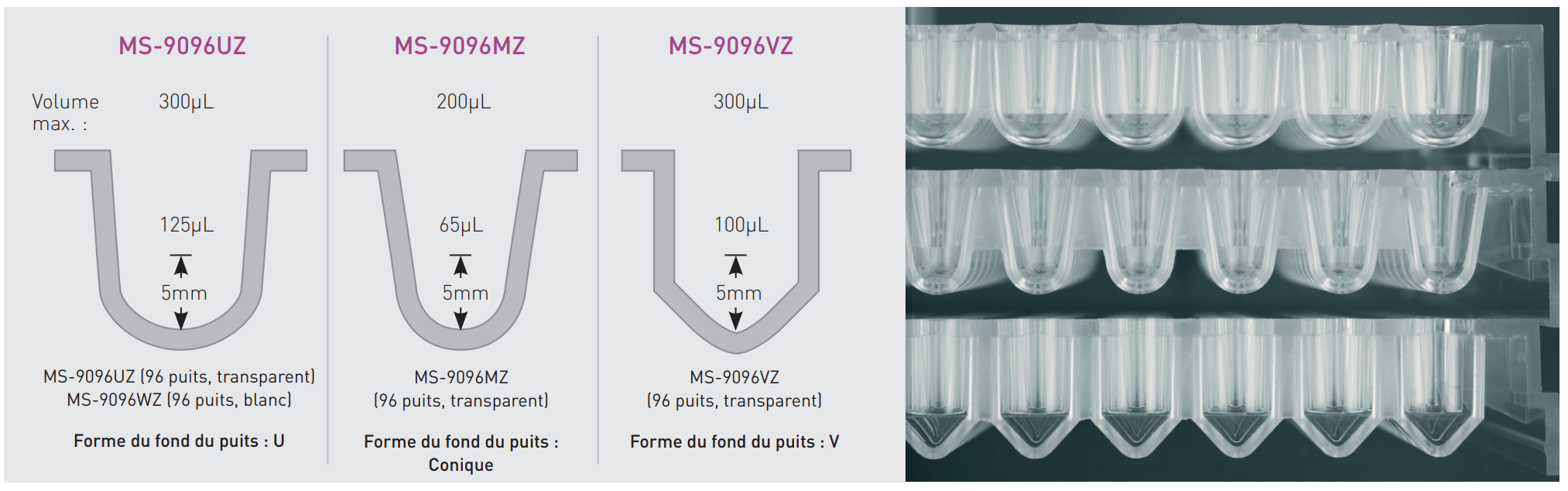 • Diversité des formes du fond du puits : forme en U, forme conique et forme en V dans le format 96 puits
