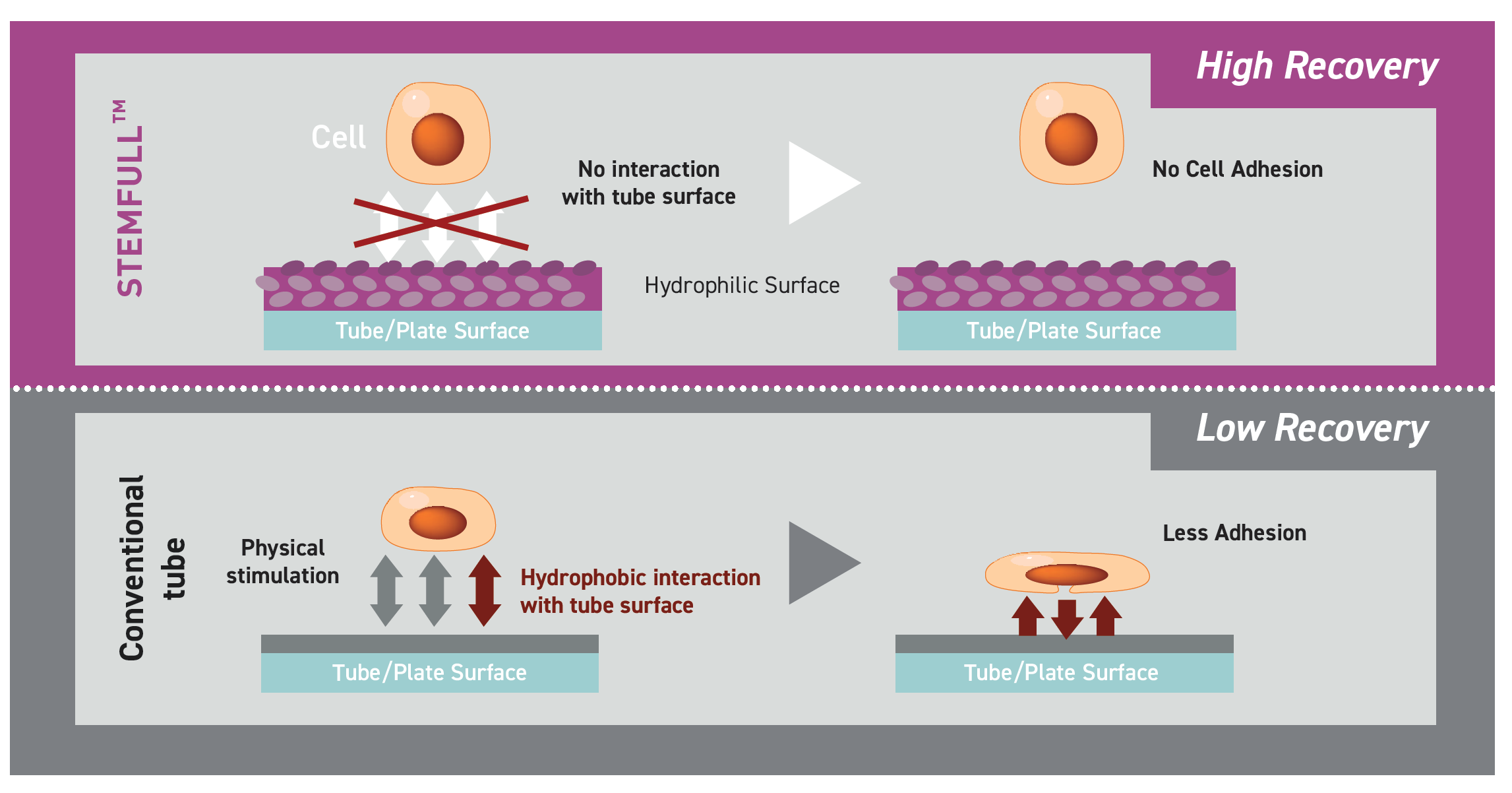 STEMFULL™ è una provetta da centrifuga con un rivestimento in polimero ultra-idrofilo che riduce al minimo la perdita di cellule da legame non specifico alla parete della provetta, con conseguenti tassi di recupero di cellule superiori dopo la centrifuga. Il polimero ultra-idrofilo sulla superficie della provetta è un rivestimento con legame covalente che riduce al minimo il rischio di eluizione del materiale.