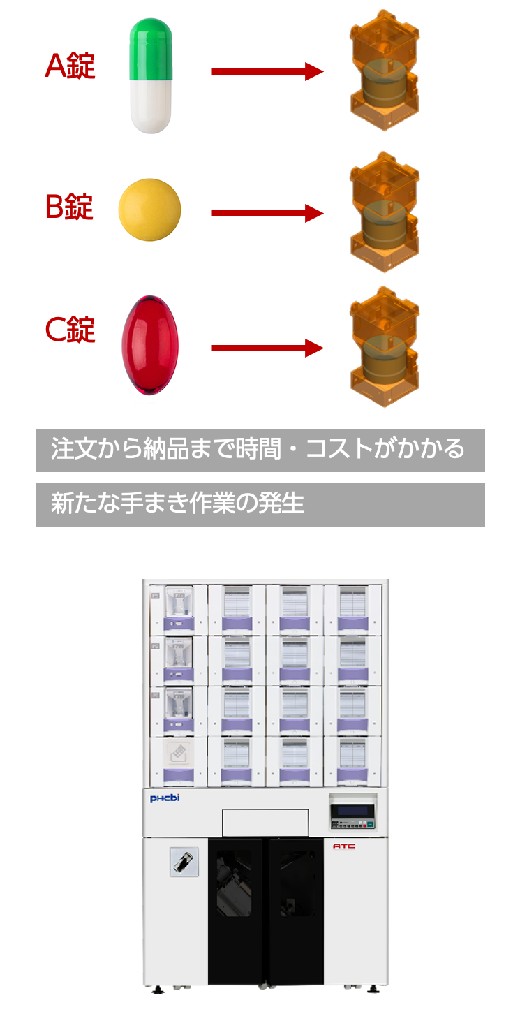 錠剤に合わせた専用タブレットケースが必要(注文 ⇒ 生産 ⇒ 納品)