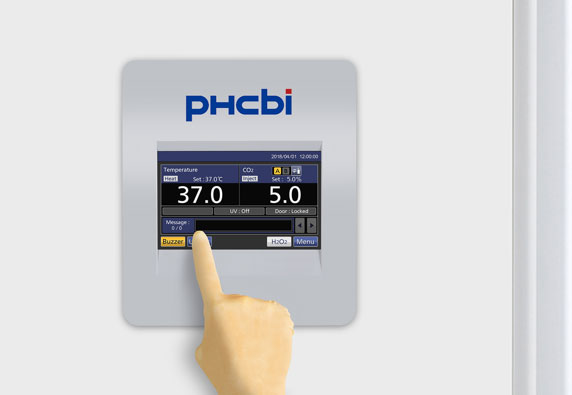 オプションで選択可能なH₂O₂除染システムは、H₂O₂発生器(MCO-HP)、器内循環ファン、UV殺菌システムと、抗菌性能に優れた銅合金ステンレスの組み合わせて開発された、PHCbi独自の安全かつ効果的な器内除染システムです。H₂O₂除染システムでは、まずミスト化したH₂O₂を器内に循環させて汚染微生物等を除染し、さらにUV殺菌システムを稼働させて器内のあらゆる内装部品を徹底的に除染します。