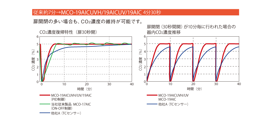 IRセンサーと、CO2濃度のPID制御により、素早い復帰*を実現しました。(特許出願中)特に扉開閉頻度の高いユーザーの方々に、より安定したCO2濃度環境を提供するインキュベーターです。