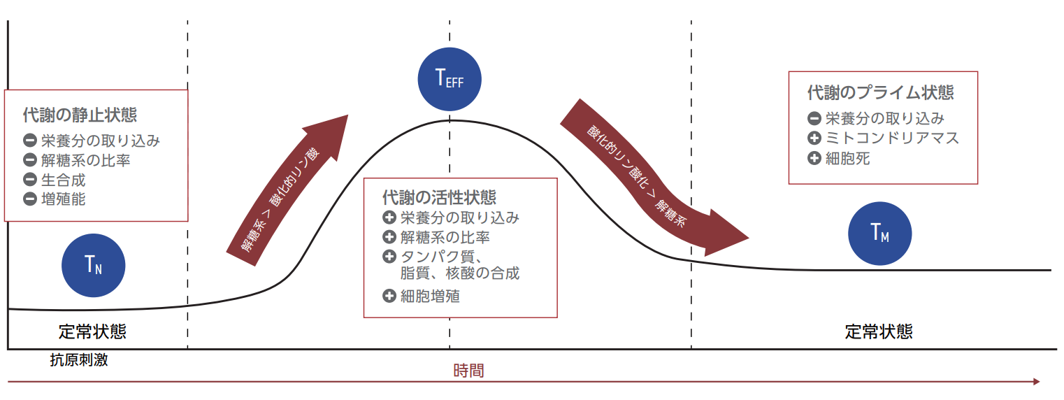 ナイーブT細胞(TN)や休止期のT細胞は、定常の代謝状態で血液中を循環する20。相補的ながん抗原に遭遇すると、PI3K-AKTmTORシグナル伝達経路が活性化され、解糖系を亢進させる転写因子が発現する20,21。解糖系が亢進したTNはエフェクターT細胞(TEFF)に分化し、免疫機能を発揮することが可能である。一旦抗原提示細胞が除去されると、TEFFの解糖系の比率が減少する。これは少ないながらもかなりの数のTEFFを刺激して、十分に分化したメモリーT細胞(TM)として長期間体内に存在する。TMとTN は解糖系のプロファイルは類似しているが、TMはミトコンドリア呼吸鎖の比率が高いため、同じ抗原に遭遇した際には迅速に再活性化することができる。もし分化する過程において代謝パラメータが条件に満たない場合には、T細胞は分化能を失ったり、抗腫瘍免疫応答を十分に発揮できなくなる場合がある22,23,24。