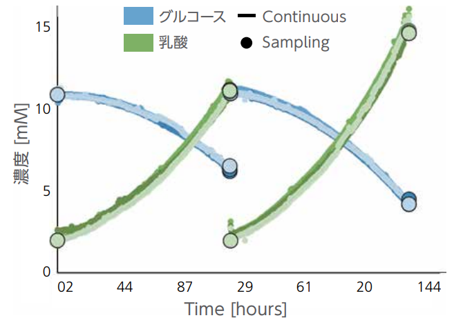図2:最新のライブセルの代謝解析技術による、グルコースと乳酸のリアルタイム測定と