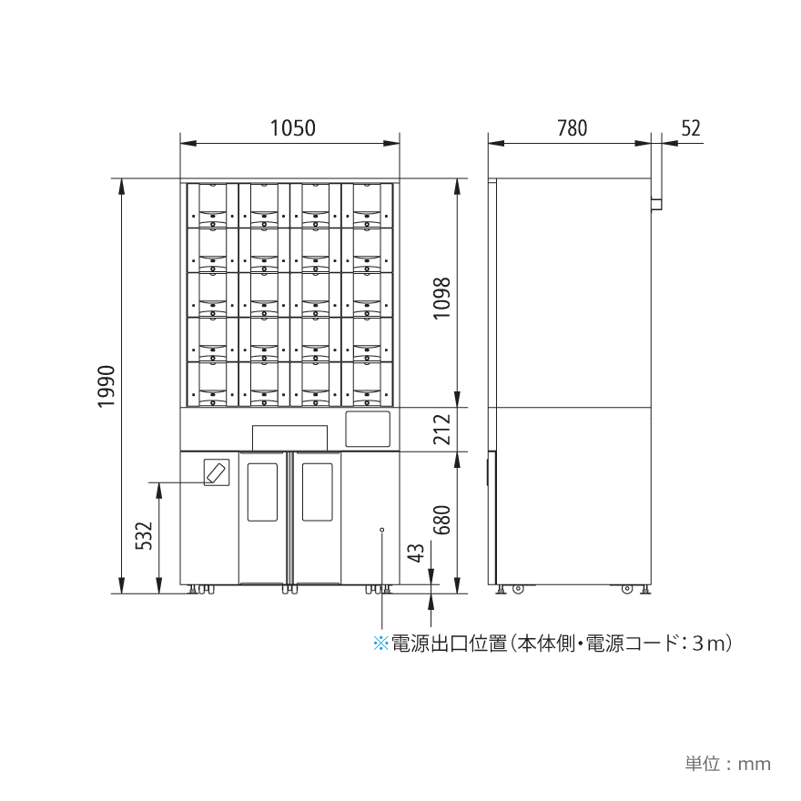 本体 幅1050㎜ × 奥行780㎜ × 高さ1990㎜ ※