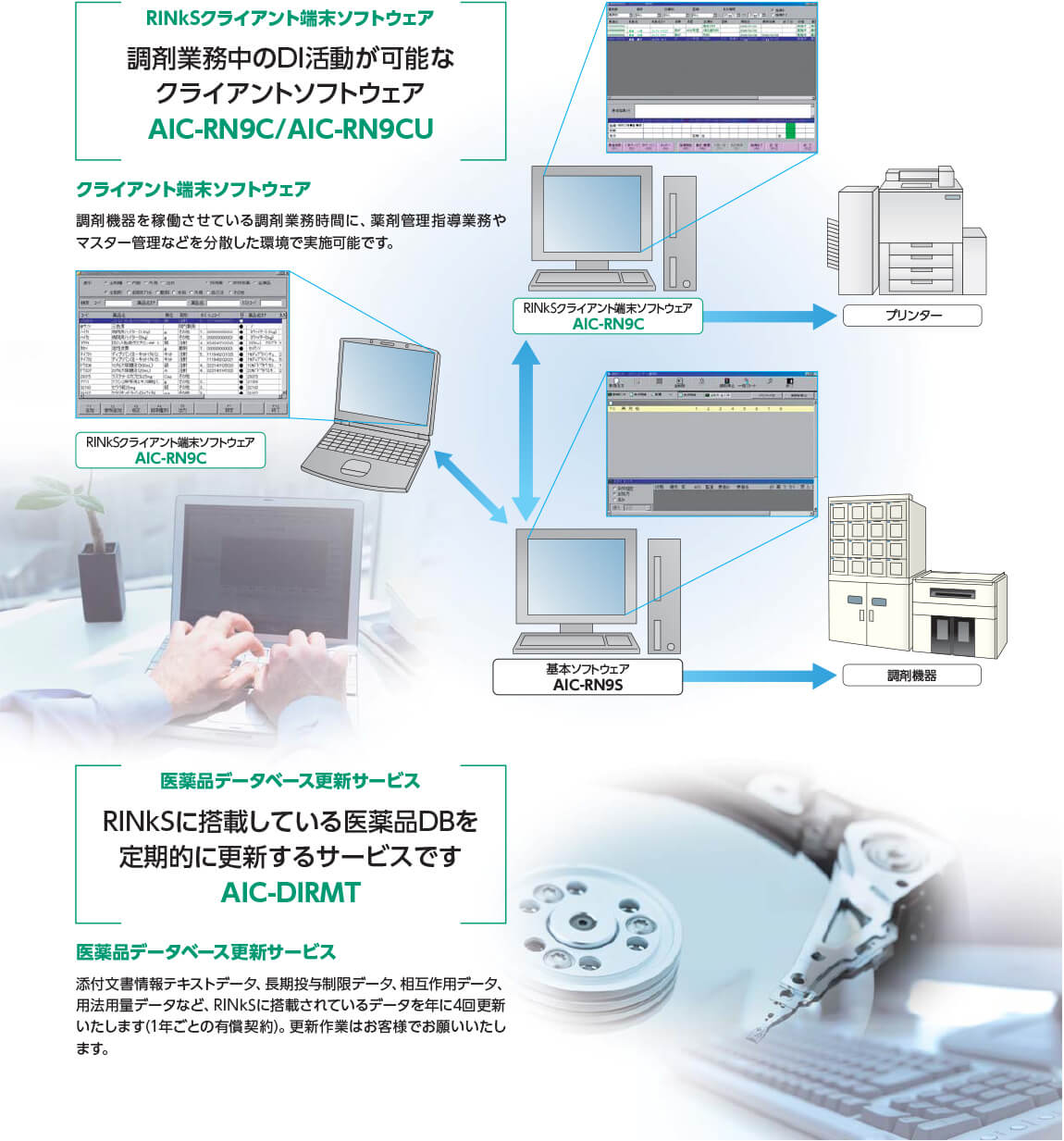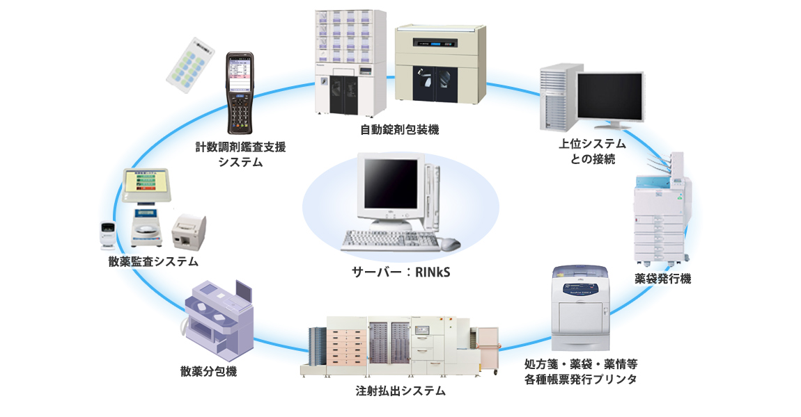 RINkSは、上位システム接続・薬剤管理指導業務支援から調剤機器の制御までを
