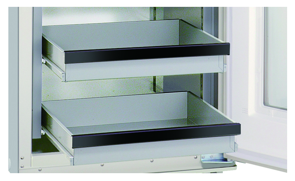 引き出しラックには、大型のボトルや試薬キット、大量の薬品類を効率的に収納・整理・保存でき、奥の収納物を取り出しやすい構造です。