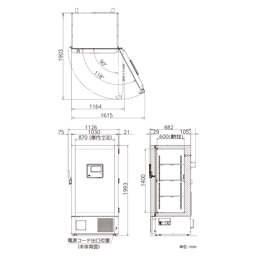 設定温度-5 ℃ ~ -40 ℃(初期設定-10 ℃) 警報設定範囲外でAlarm表示文字点滅・庫内温度表示点滅・約15 分遅延後Warning表示・ブザー断続音・遠隔警報出力