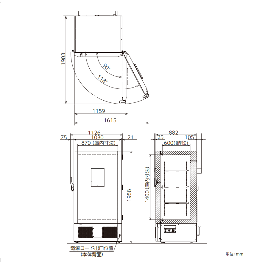 設定温度-40 ℃~-5 ℃(初期設定-10 ℃) ステータスインジケータ―橙点滅 庫内温度表示点滅、二次元バーコード表示 約15 分遅延後、ステータスインジケータ―赤点滅、ブザー断続音、遠隔警報出力、二次元バーコード表示