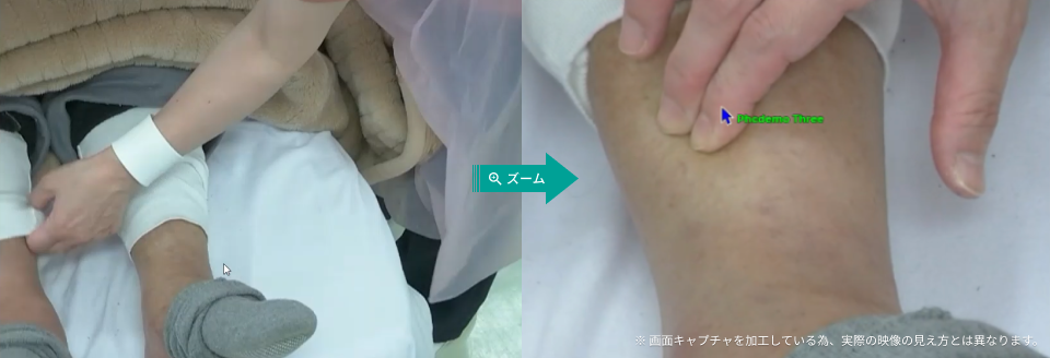 アノテーション機能を活用し、遠隔側からの操作で前脛骨部に照準を合わせ、青い矢印を支援先病院側のディスプレイに表示し共有。映像だけで圧痕性浮腫の程度を診断しました。言語とアノテーション機能の活用でスムーズなコミュニケーションを実施することができました。