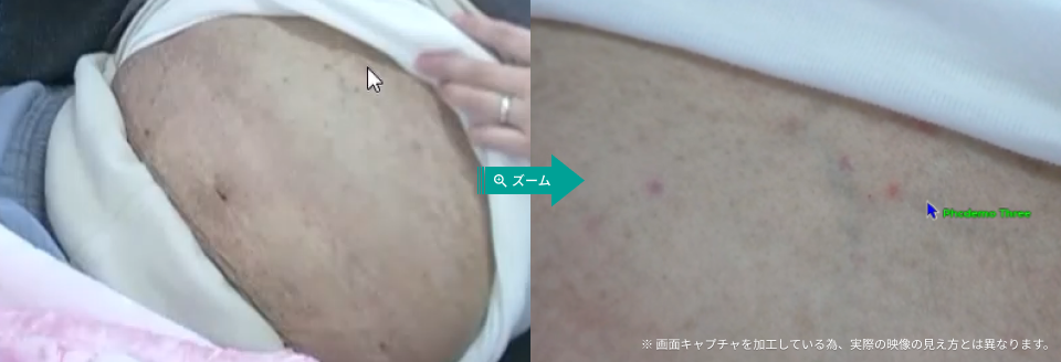 特にお腹が痒いということで、皮膚所見を確認しました。遠隔側のマウス操作で位置調整・ズームを行い痒いところに照準を当てると、掻爬痕がくっきりみられ、アノテーション機能を活用し、所見を支援先病院側と映像を共有しました。拡大してみると腹部全体に色素沈着が見られ、慢性的にそう痒があり、掻爬し続けていることがわかりました。