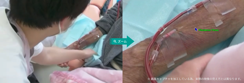 全身のそう痒感ありとのことで、シャント肢の掻爬を確認しました。また、シャント静脈の膨らみ・くぼみがないかなども合わせて確認しました。穿刺部に皮下出血を疑うような所見があり、アノテーション機能を使い、映像を支援先病院と共有しました。