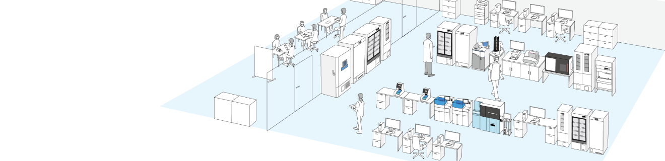 PHCは、検体検査機器・試薬、病理検査機器、保存機器を組み合わせ、検査室全体を包括的にサポートします。検査の業務フローに沿った機器配置と連携により、業務効率化・情報連携・高精度を実現し、検査技師が本来の専門性を発揮できる環境を提供します。