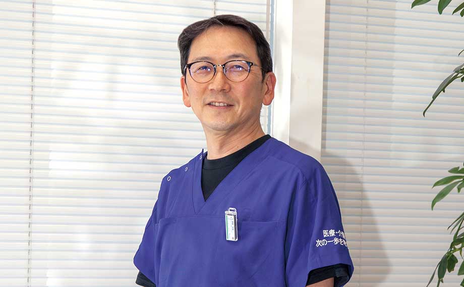 「新しいことが好きなんですよ」という齋藤先生は、袖に“医療・介護 次の一歩を考える”というクリニックの理念を刺繍したユニフォームを着用し、地域医療に対する姿勢を表わしています。