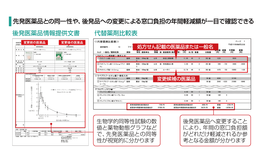 多彩なデータベースを搭載・後発医薬品データベースで窓口負担金額の比較表も簡単に発行