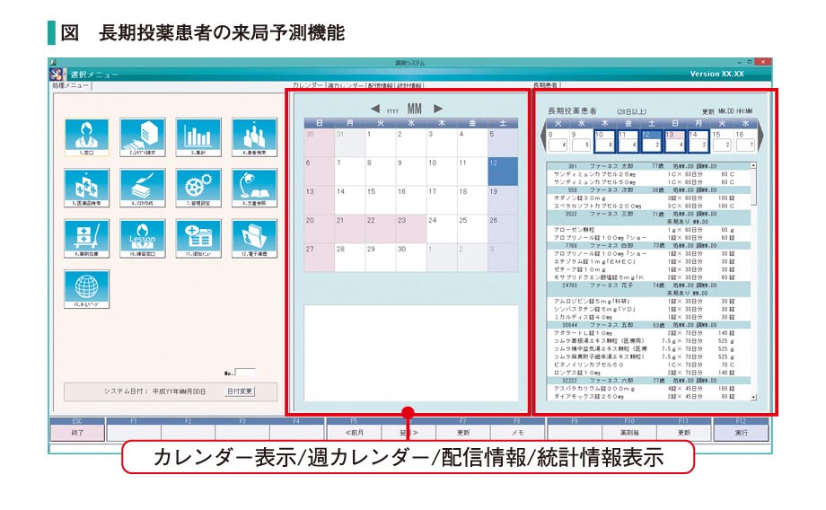 選択メニューでは、「長期投薬患者の来局予測機能」が医薬品の在庫確認に役立ちます。また、薬局の予定を入力できるカレンダー、プログラムやデータベースの配信、月別や年代別の患者数・調剤点数なども確認できます。