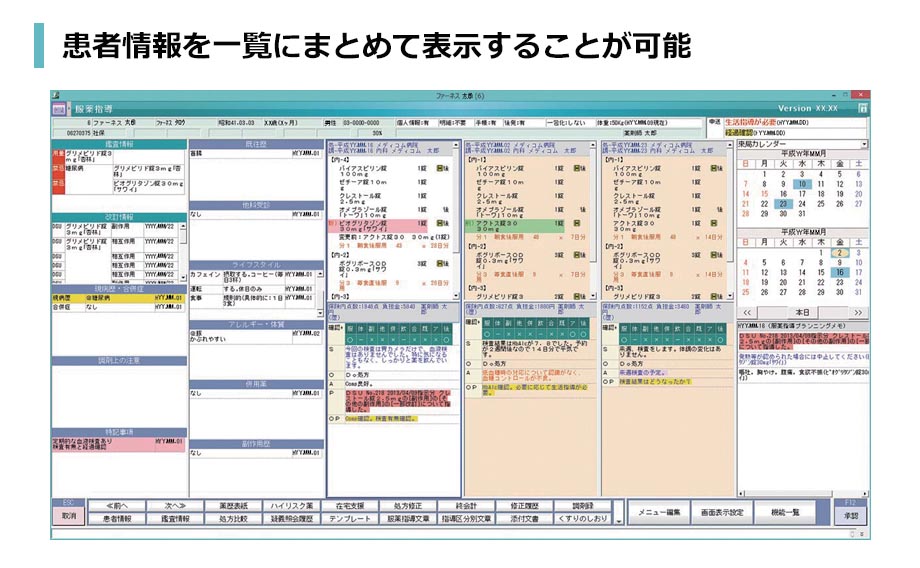 「PharnesIII-MX」は、薬歴表紙や監査情報、過去薬歴などを一画面に表示し、必要な情報を一度に確認することが可能です。また、今回と過去4回分の調剤内容と指導内容を並べて表示でき、処方内容の変更部分は色分けして表示されるため、山本先生は「処方の変化を簡単に確認できるのが非常に便利だと感じています」と話します。