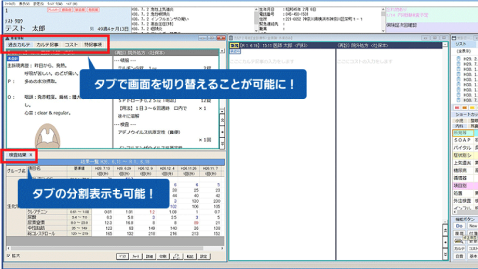 画面のタブ切り替え・分割表示により、見たい情報を表示しながらカルテ入力