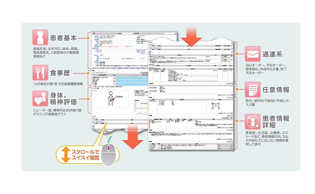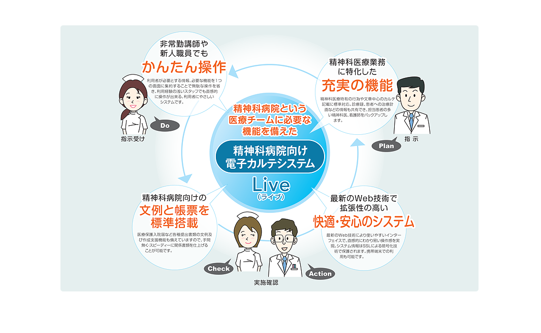 病院用医事コンピューター「Medicom-HSif」と、精神科に特化した電子カルテシステム「Live(ライブ)」とのスムーズな連携が医療スタッフ同士一体となった効率の良いチーム医療体制を実現します。