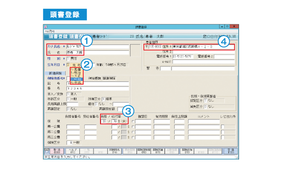 初診時の頭書登録では、住所データベース、保険者データベースも標準搭載し、入力を簡素化しました。