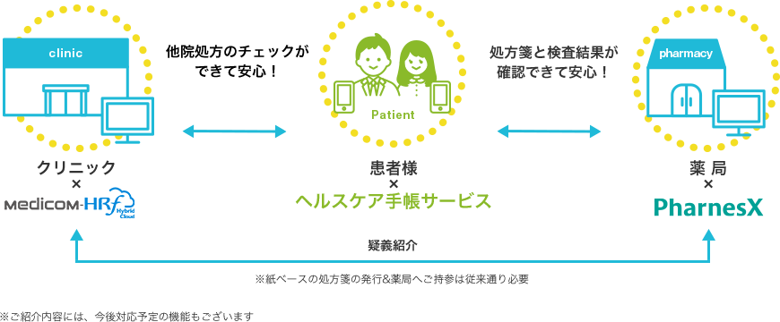 ヘルスケア手帳を介して電子カルテ・薬歴データを活用し、日々の業務をサポートします。