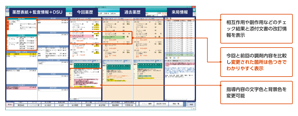 処方監査に必要な患者さんの情報を、画面の切り替えなしで一画面に並べて確認できます。また、要チェック項目はカラー表示されるので、正確でスピーディーな処方監査、薬歴作成が可能となります。