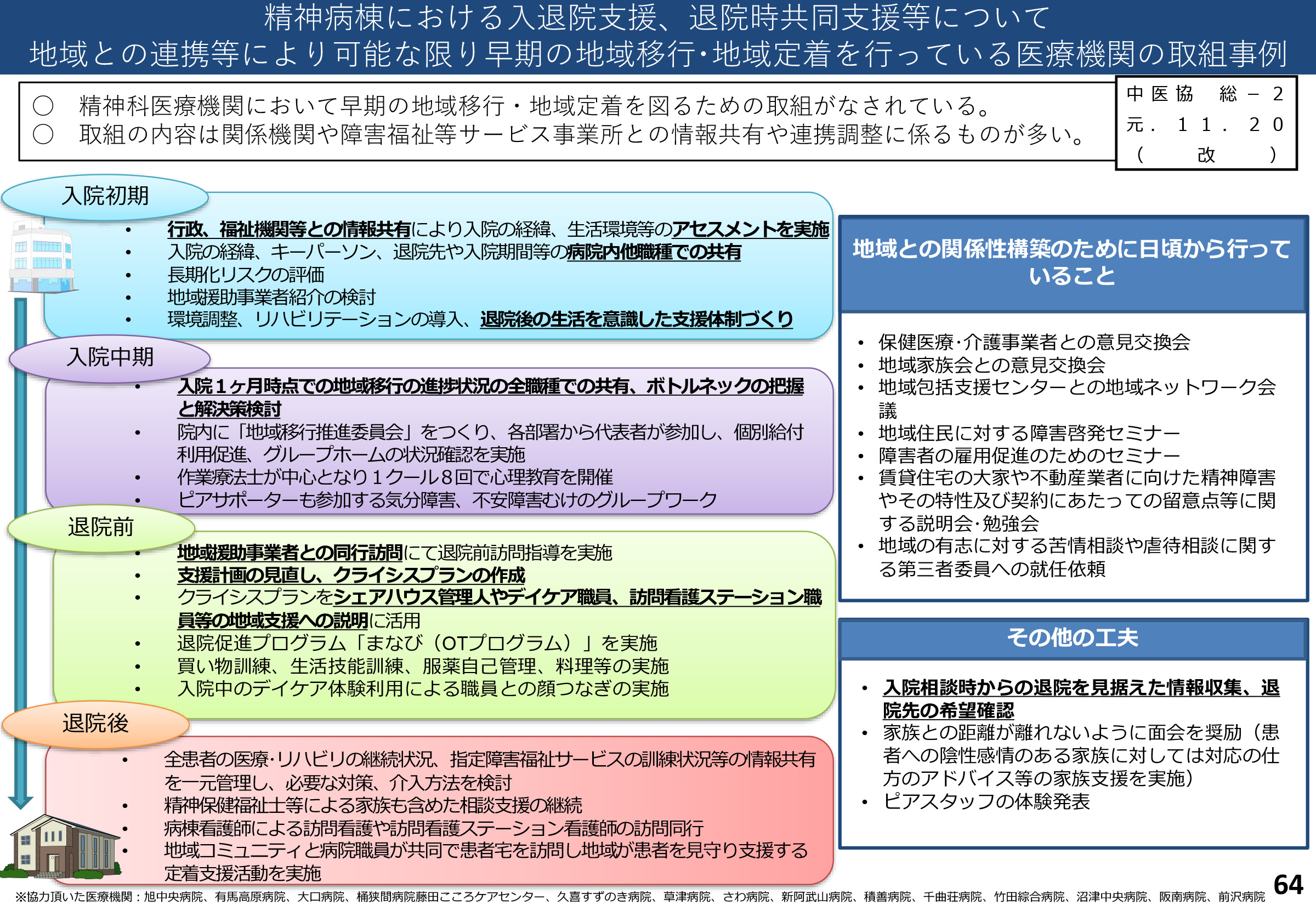 ◆精神病床からの地域移行だけでなく、「精神障害にも対応した地域包括ケアシステム」の構築を目指すにあたり、同システムにおける医療機関の役割としてケースマネジメントの実施が求められており、精神病床において、入院早期から多職種が介入して入退院支援を実施することに係る評価について診療報酬の調整が行われる見込み。