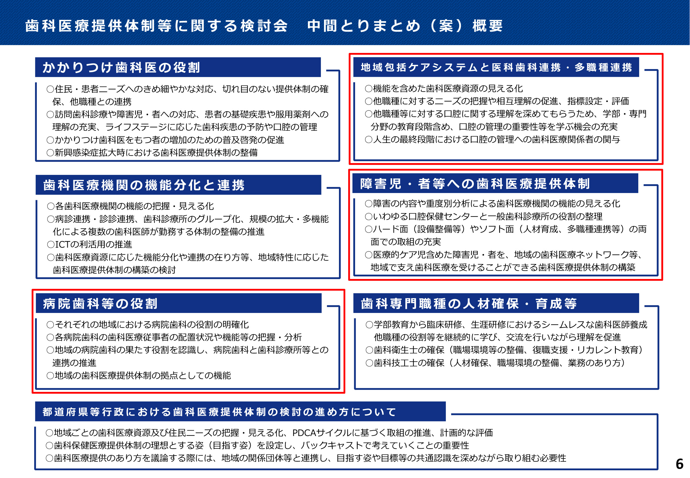 今後、病診連携・診診連携、歯科診療所のグループ化、規模の拡大・多機能化による複数の歯科医師が勤務する体制の整備の推進、テレビ電話を利用して歯科診療を受けるなど、ICTの利活用の推進など注視が必要と思われる。