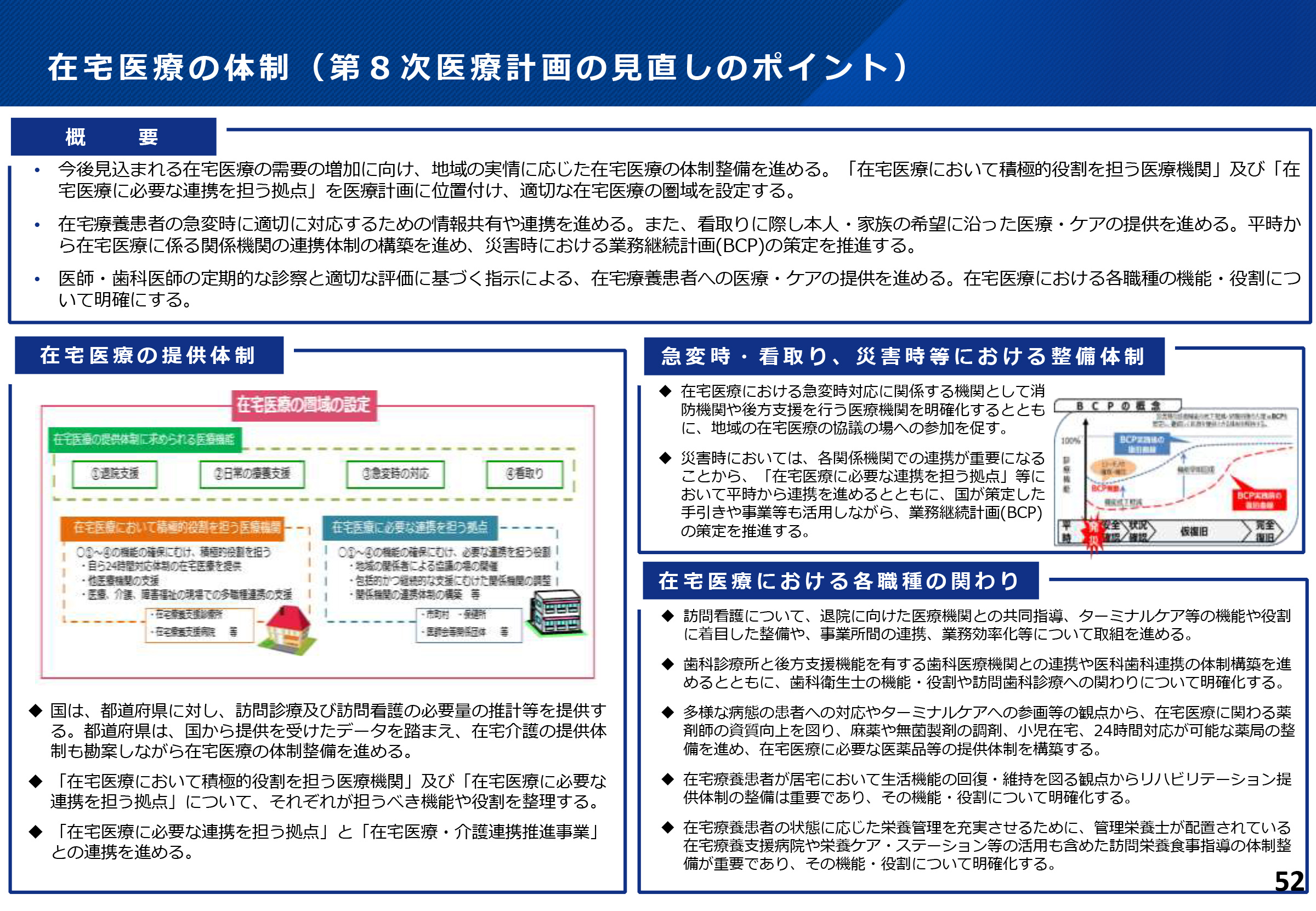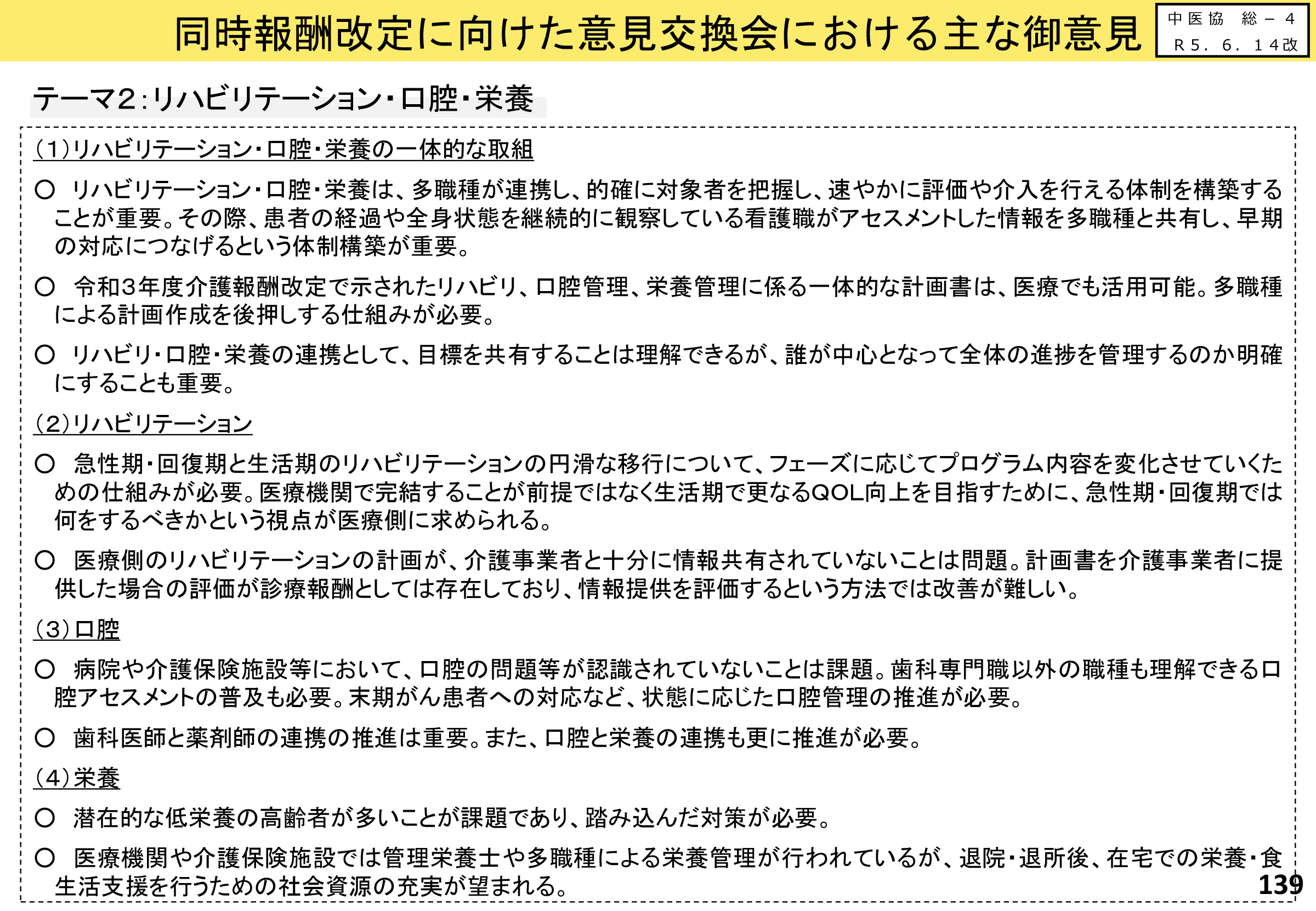◆回復期病院や慢性期病院において、口腔と栄養の管理が一体的に行われることは、誤嚥性肺炎や低栄養の予防の観点から重要であり、地域の歯科診療所との連携や、リハ・口腔・栄養の一体的な取組を進めるべきとの意見から、かかりつけ歯科医の役割、歯科医療機関の機能分化と連携、病院歯科等の役割、地域包括ケアシステムと医科歯科連携・多職種連携等が検討された。