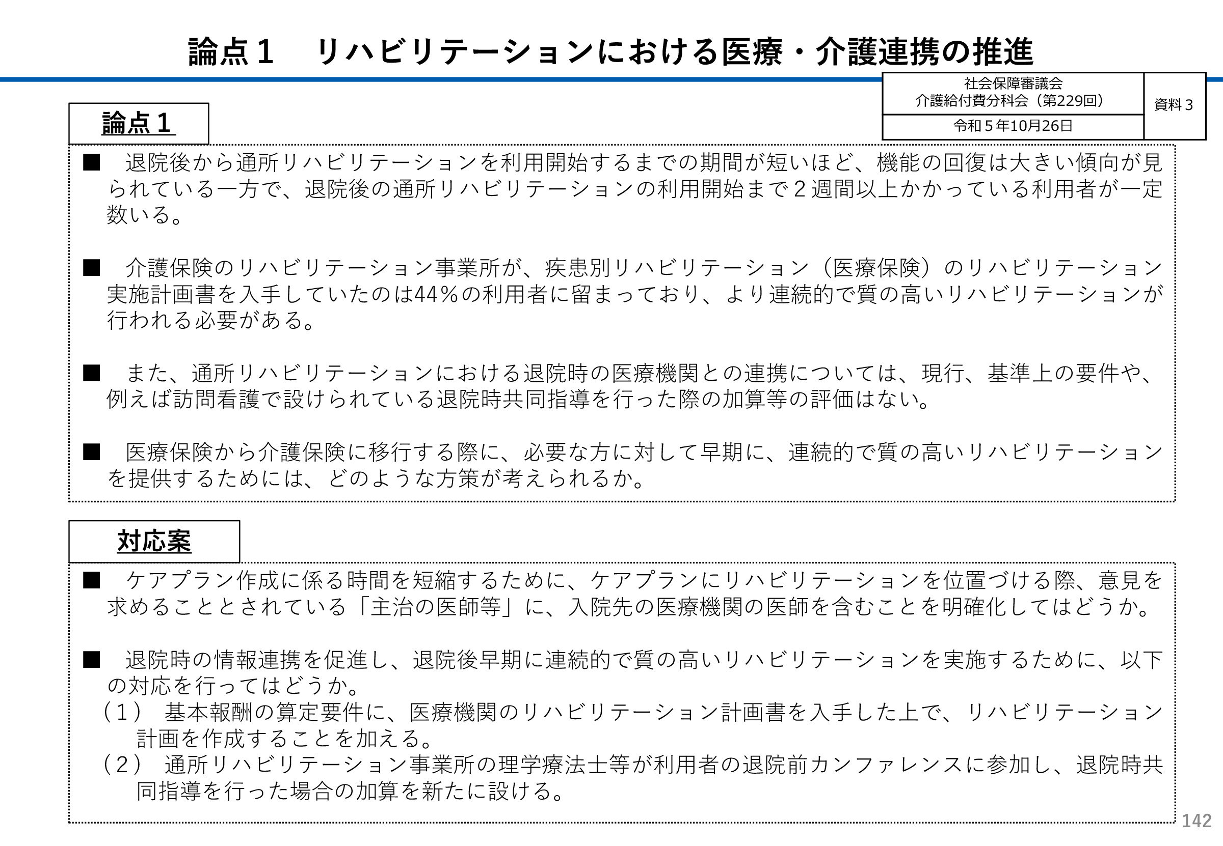 切れ目のないリハビリ提供が望まれるが、介護保険リハビリでは「医療保険リハビリの情報を把握していない」ことなどが明らかとなり、社会保障審議会・介護給付費分科会では「通所リハビリ・訪問リハビリでは医療保険リハビリの情報を把握したうえでリハビリ実施計画を作成し、リハビリを実施する」ことを義務付けてはどうかといった案が出されている。
