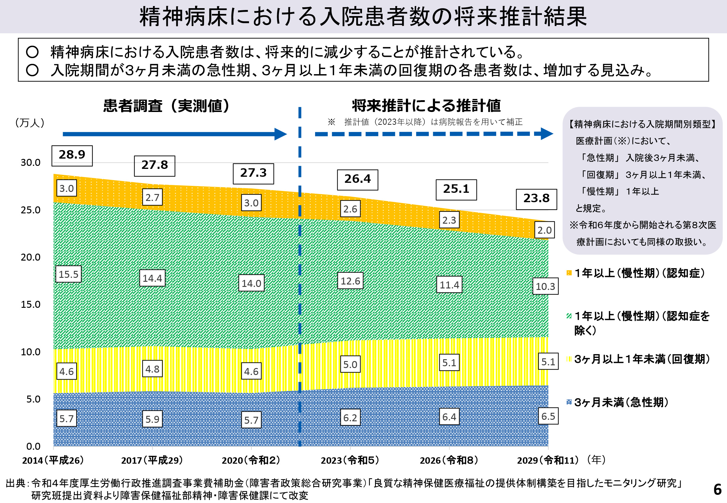 11月22日開催の中医協総会において、令和6年診療報酬改定に係る「個別事項(その6)」について議論が行われた。主な内容は、「精神医療の現状について」、「地域移行・地域定着の推進のための取組について」、「精神病床における入退院支援に係る取組について」、「地域移行を重点的に進める精神病棟の詳細について、「児童思春期精神医療について」など◆精神疾患を有する総患者数は増加しているが、精神疾患患者の入院数は減少傾向。また、精神病床全体の平均在院日数が減少している一方で、長期入院患者の高齢化とともに5年以上の長期入院患者数は顕著に減少。他、外来患者数、なかでも低年齢の受診患者等が特に増加。これらの現状を踏まえて、医療・介護・障害福祉サービスの提供や連携を一層進める方針が議論された。