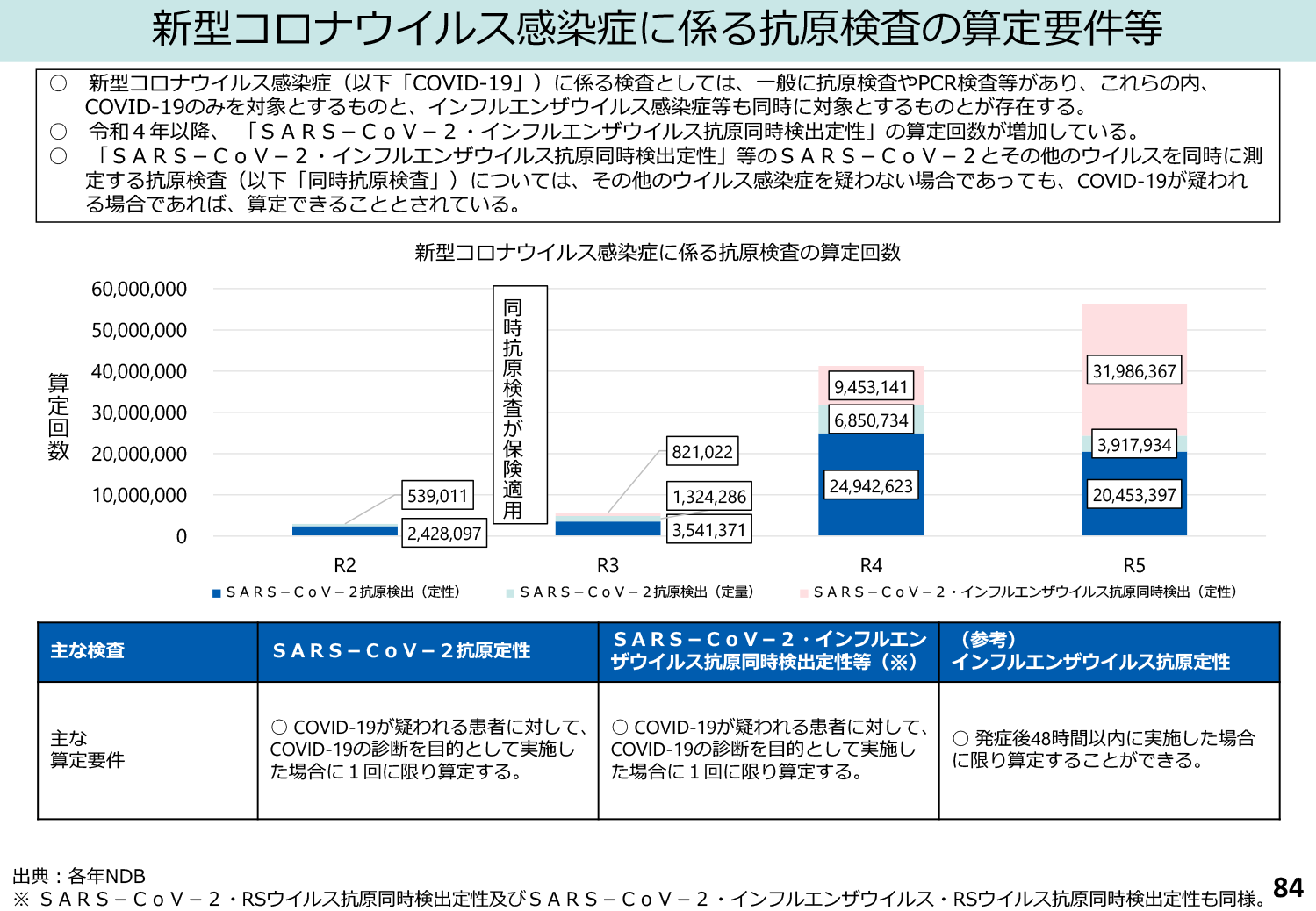 ◆現在、新型コロナとインフルエンザの同時抗原検査は、新型コロナが疑われる場合であれば算定可能となっていますが、関係学会から「どちらか一方の患者しかほとんど検出できない時期では、特別な必要性がない場合は単独の検査キットを優先的に使用することが望ましい」と提言されていることから、今後は算定要件が見直される見込みです。具体的には、流行状況や両方の検査が必要と医学的に判断される場合に限って、同時検査を実施するべきという方向です。