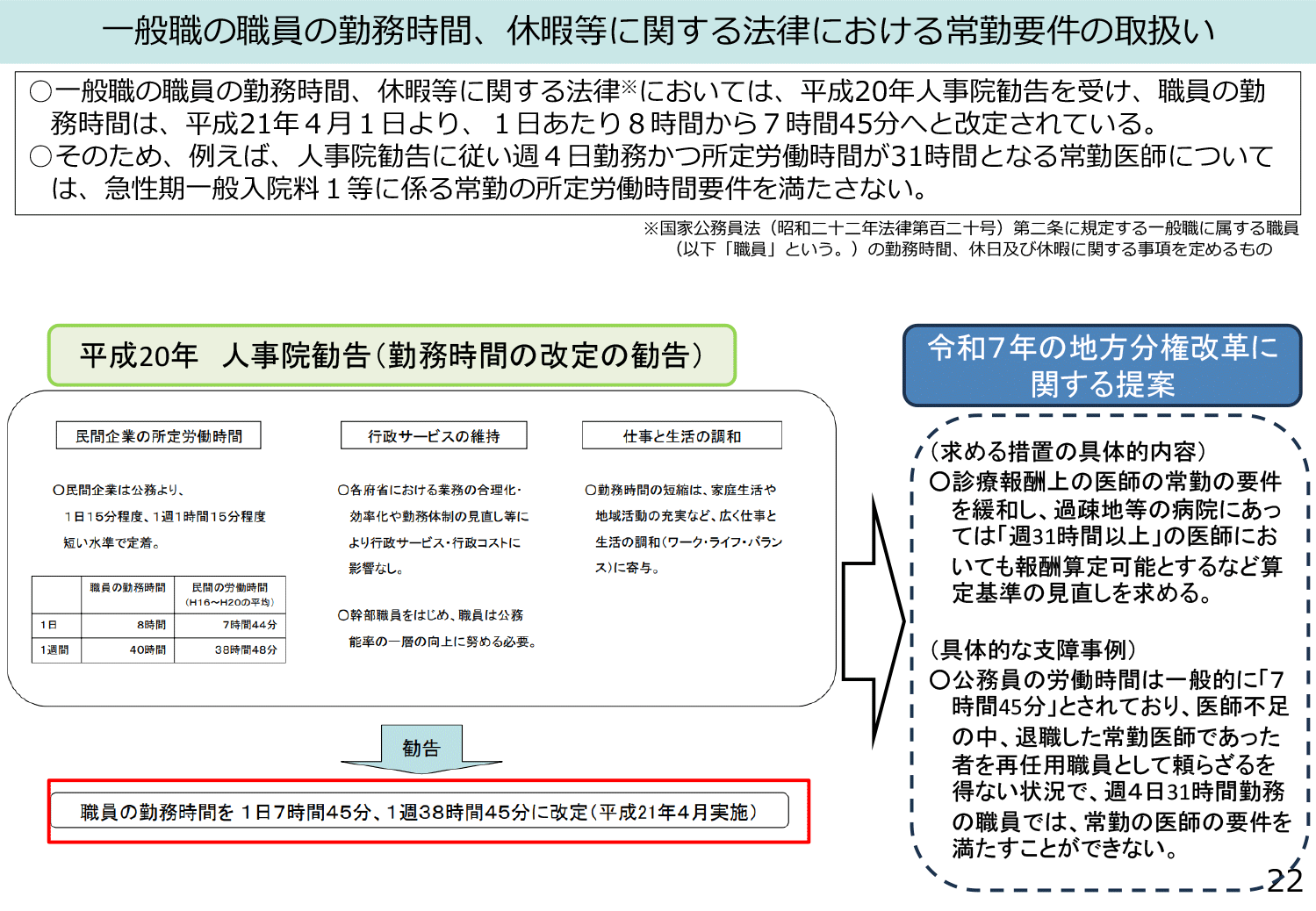 ◆まず、届出に関しては、常勤要件に関する勤務時間の整理について議論されました。入院基本料などでは「週4日以上・週32時間以上」が常勤要件ですが、公務員一般職の勤務時間は週31時間となっており実態と基準にズレが発生しているため、これを解消するべく勤務時間要件の見直しが行われる見込みで議論されています。また専従要件においては、人材確保や働き方改革の観点から、月の一定時間までは院内で他業務に従事できるようにすることなどを認めることなどが論点となっています。