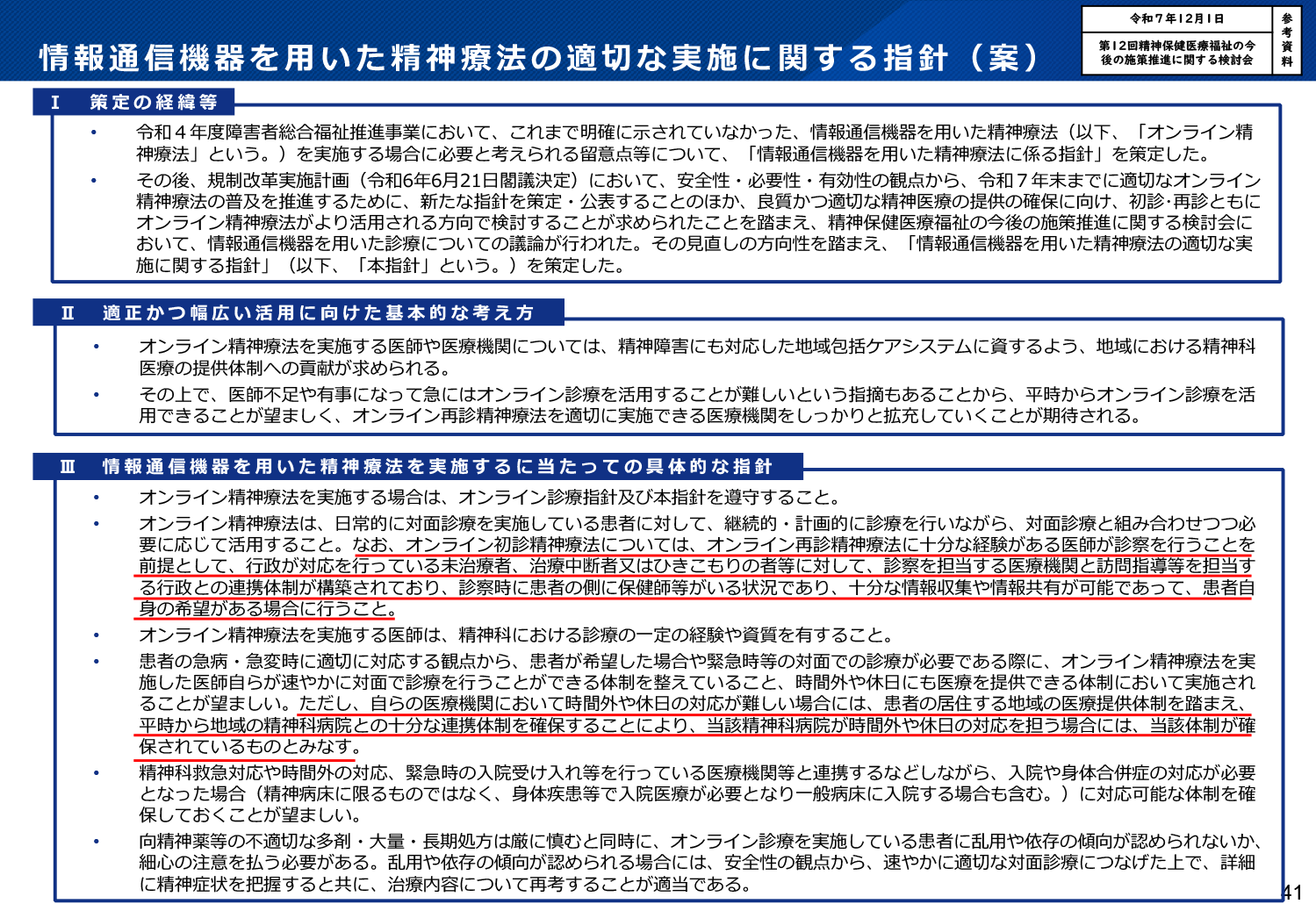 ◆「オンライン精神療法の拡充」。再診でのオンライン精神療法が認められたものの、初診での実施は科学的知見が限定的であることから慎重な姿勢が示されています。一方で、行政支援を活用した初診オンライン療法の条件付き容認や、施設基準の緩和が次回改定の議論の軸となっています。