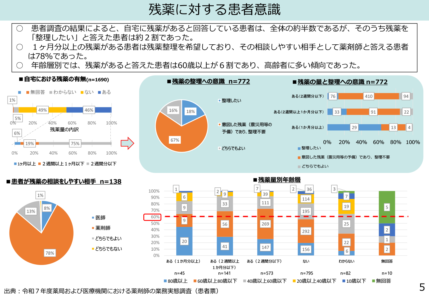 ◆調査によると、約半数の患者が自宅に残薬を抱えており、そのうち「整理したい」と考える人は2割程度にとどまっています。一方で、残薬について相談しやすい相手として、8割の人が薬剤師を挙げています。このことから、薬剤師と医療機関が連携して残薬の確認や調整を行う重要性が高まっているといえます。