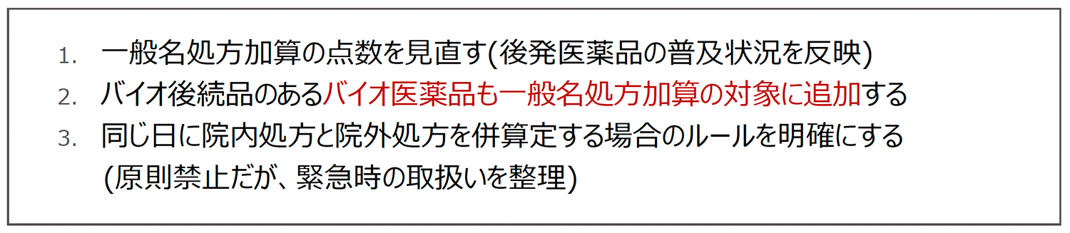 ◆一般名処方加算については、医師が一般名で処方するのみではなく、患者に対して後発医薬品の意義や薬剤変更に関する説明が適切に行われているかが要件化される方向で検討されています。併せて医療機関内での掲示や説明体制の整備も求められる見込みであるため、医事スタッフを含む院内全体での患者対応力が問われる内容となっています。