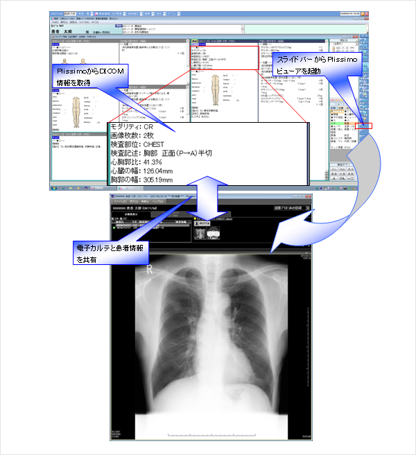 近年、医療情報のデジタル化が進められておりますが、電子カルテシステムとPACSはそれぞれで導入が進んでおり、診療業務の効率化のため、医療機器間の連携が求められています。 本システムは、三洋電機株式会社*の電子カルテシステム「Medicom-HRII(メディコム エイチアールツー)」に、パナソニック ヘルスケア株式会社の子会社、パナソニック メディカルソリューションズ株式会社のPACS「Plissiomo(プリッシモ)」を一体化させた商品です。患者情報の共有、各種DICOM※2データ連携を実現させています。